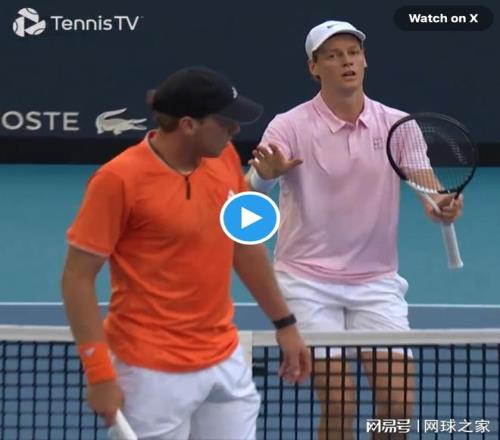辛納當(dāng)即做出反應(yīng),立刻向?qū)Ψ街虑?,兩人在網(wǎng)前進(jìn)行了簡(jiǎn)短輕松的交流。盡管這球最終出界,但此前已碰到米歇爾森的球拍,因此這一分判歸辛納。